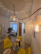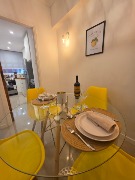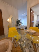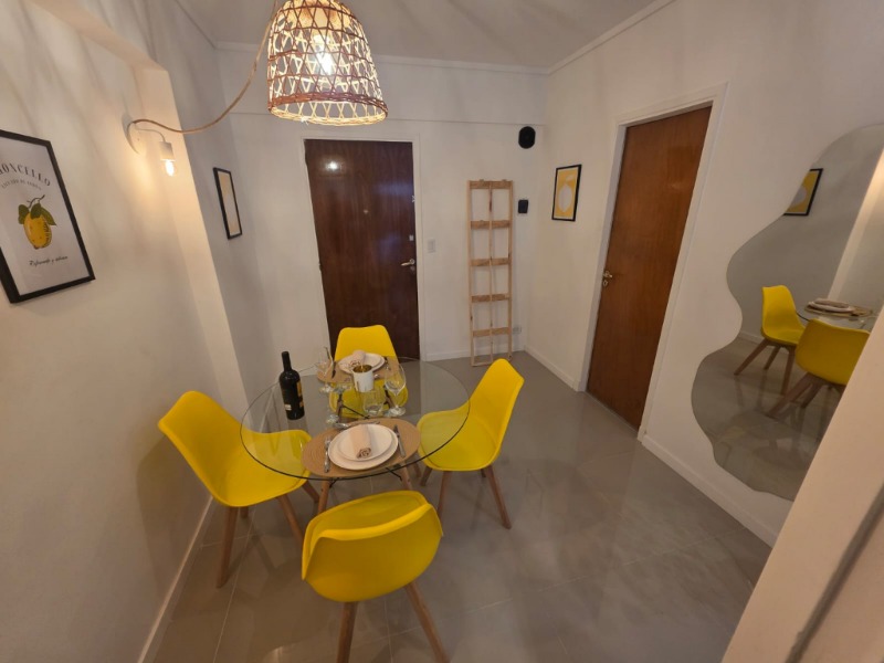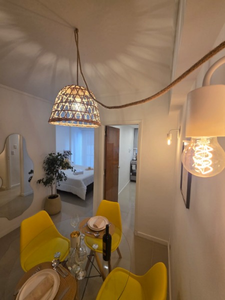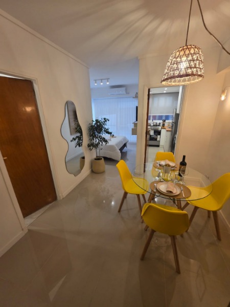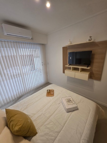 Ambiente dividido con amplio ventanal de piso a techo súper luminoso, cama sommier a estrenar de dos plazas, resplado de cama con mesas de luz incorporadas, mesa con 4 sillas a estrenar, rac con TV Smart 32 pulgadas nuevo, aire acondicionado frio calor, plantas, perchero de pie, cortinas, acolchado y decoración.