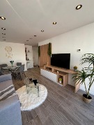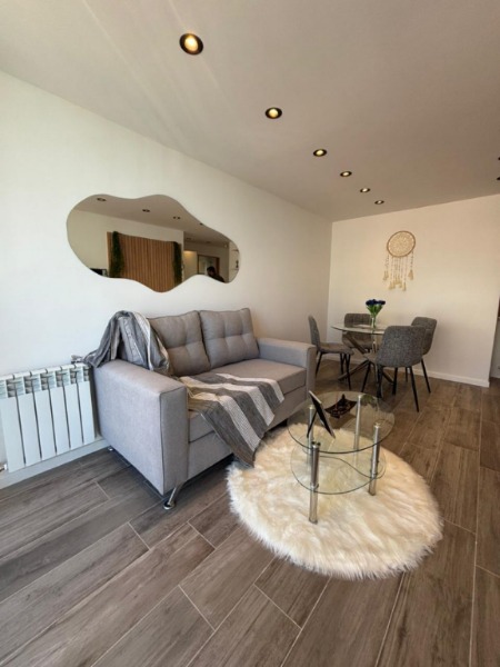 Mesa con 4 sillas, sillón de dos cuerpos, Rack TV y TV 32 pulgadas smart.