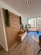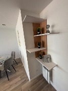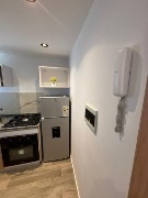 Cocina separada con mesada de cuarzo, bajomesadas a medida, equipada con cocina a gas, heladera con Freezer, termotanque eléctrico y pava eléctrica.