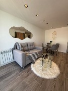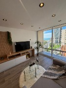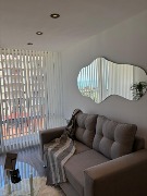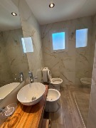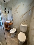 Baño completo con puerta vaquero, espacio para lavarropas, espejo led con desempañador y temperatura. Ducha con mampara. Equipado con lavarropas de carga superior.