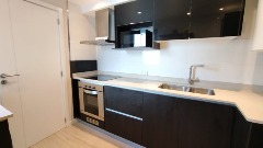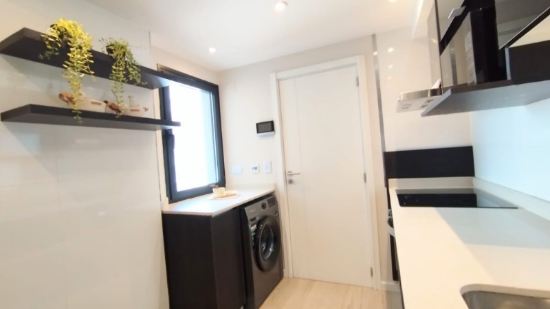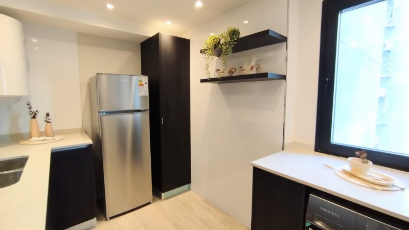 Cocina separada con mesada de cuarzo, bajomesadas a medida, equipada con cocina a gas, heladera con Freezer, termotanque eléctrico y pava eléctrica.