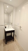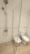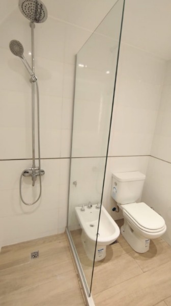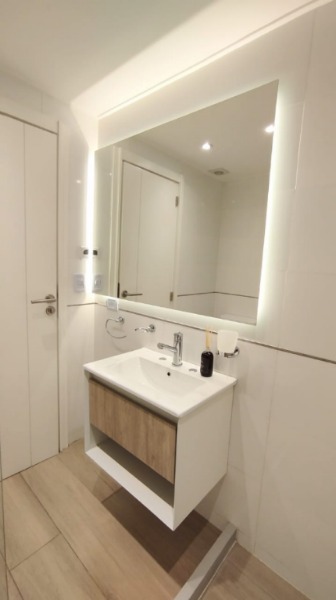 Baño completo con puerta vaquero, espacio para lavarropas, espejo led con desempañador y temperatura. Ducha con mampara. Equipado con lavarropas de carga superior.