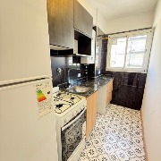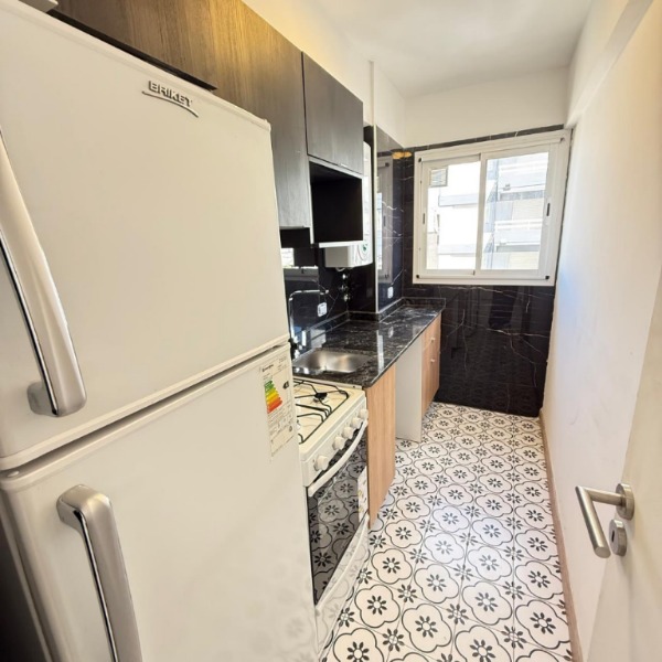 Cocina separada con mesada de cuarzo, bajomesadas a medida, equipada con cocina a gas, heladera con Freezer, termotanque eléctrico y pava eléctrica.