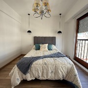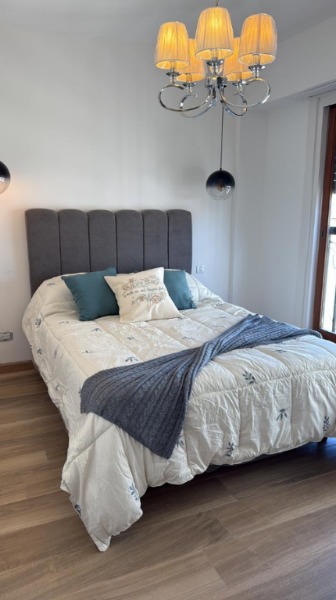 Dormitorio al contrafrente con pisos de parquet plastificados, placard empotrado y juego de dormitorio a estrenar.