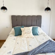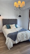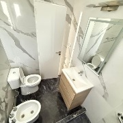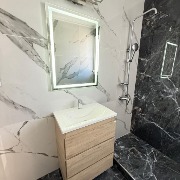 Baño completo con puerta vaquero, espacio para lavarropas, espejo led con desempañador y temperatura. Ducha con mampara. Equipado con lavarropas de carga superior.