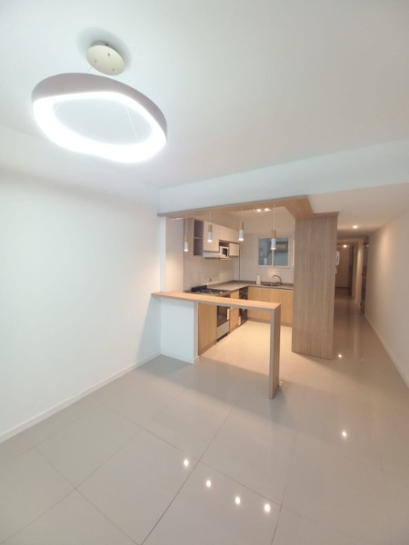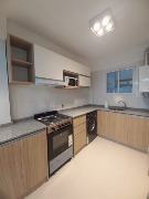 Cocina separada con barra desayunadora y muebles a medida. Equipada con cocina, calefón, lavarropas y microondas. Todo a estrenar.